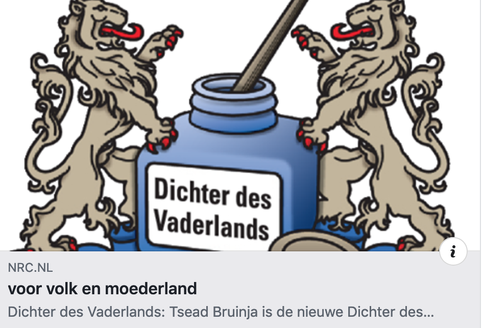 Het bericht werd eergisteren bekend. Tien jaar geleden was er ook een kans op [mijn column 03-01-2009⇲] Toen heb ik er op gestemd. Dat konden liefhebbers toen nog. Nu boog er een deskundige jury zich over de vraag wie het zou moeten worden. Tsead Bruinja is dan eindelijk Dichter des Vaderlands⇲ geworden. En dat gaat er mooi uitzien als ik zijn eerste bijdrage lees> belooft dat meer grenzeloos taalbehendigheid.