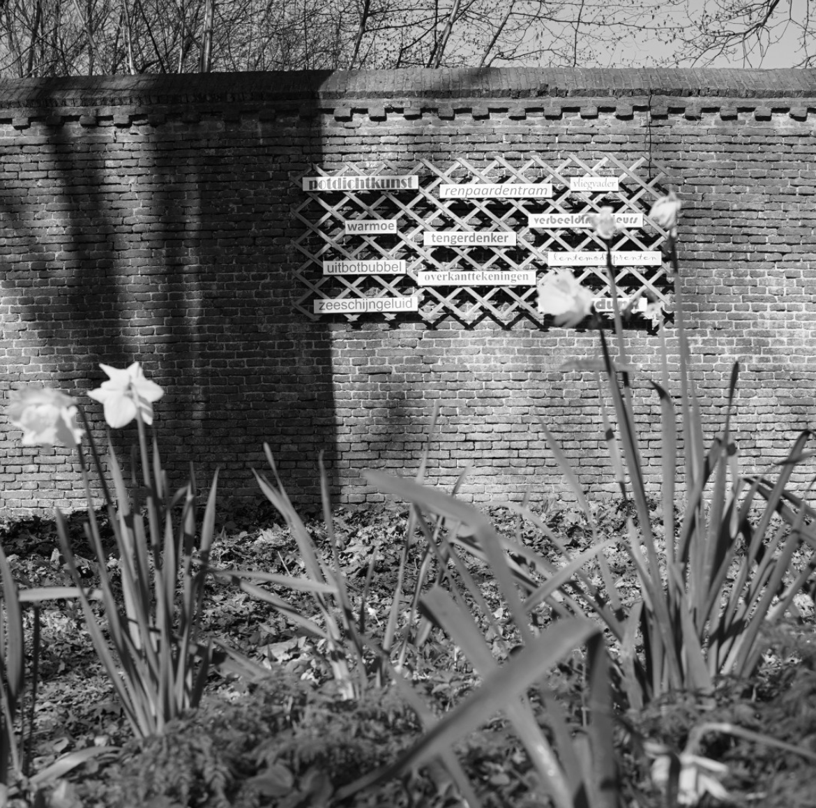 Huub Claessens 👉 fotografeerde ook de Muurbloemlezing met 11 éénwoordgedichten, die De Omsmeders op de tuinmuur hebben samengesteld.